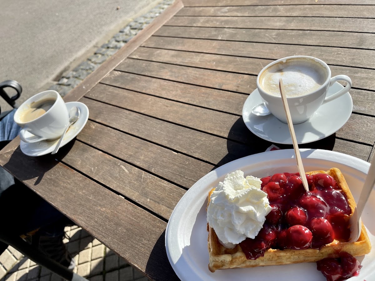 Whether you’re indulging in a rich cup of coffee or savoring something a bit more decadent like a glass of champagne, every sip feels like a small celebration. Customers rave about the café's offerings, especially the Belgian waffles served warm, generously dusted with cinnamon and sugar, a perfect companion to a creamy latte or refreshing wine spritzer. “Die Waffeln wurden gut warm serviert, sie waren schön groß und schmeckten echt super,” recalls a satisfied visitor, highlighting just how fulfilling these treats are after a stroll through the picturesque surroundings.